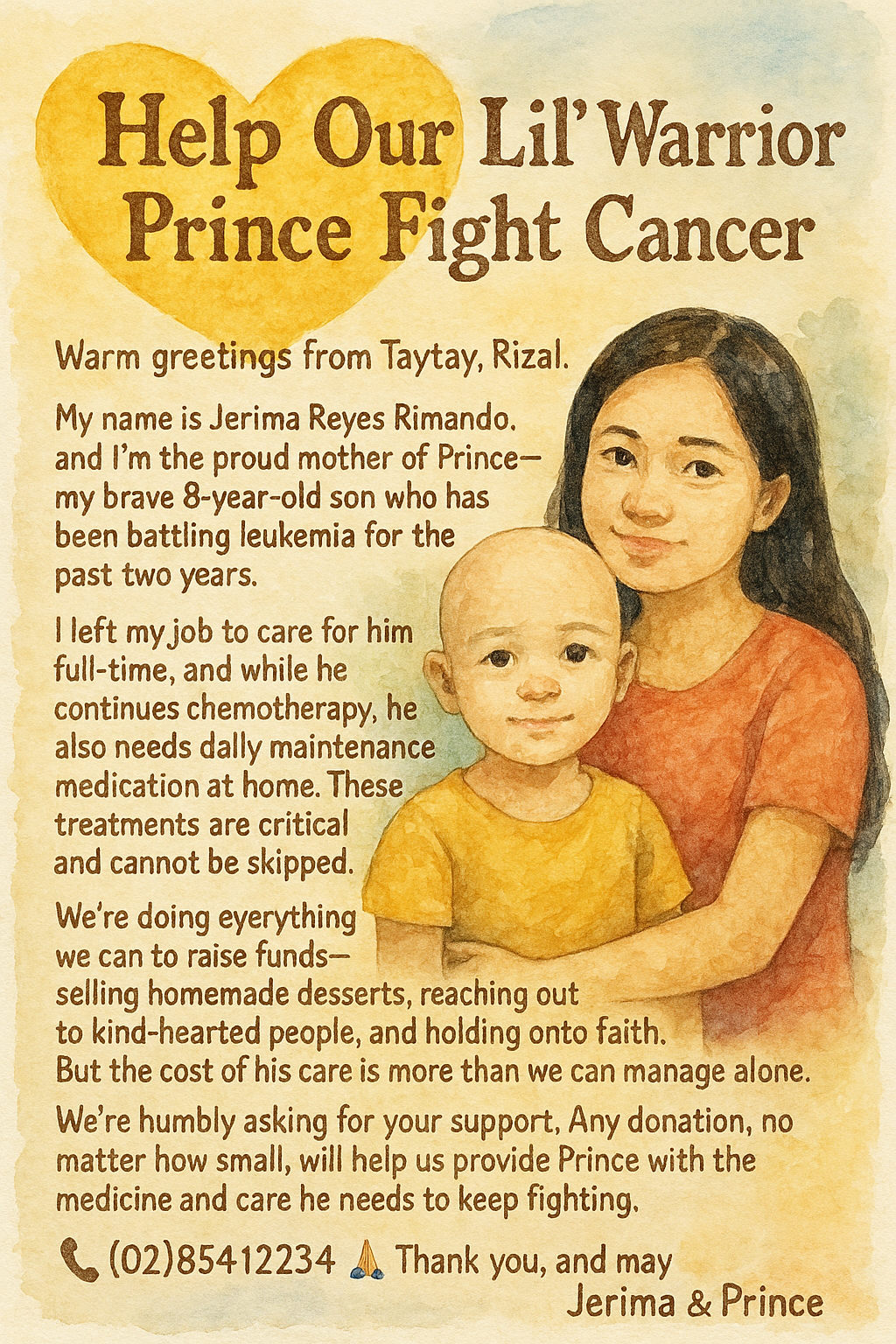 I am Jerima Reyes Rimando residing in Taytay Rizal Philippines, mother of Prince I left my job to take good care of my child. He was diagnosed with Leukemia for the past 2 years and He still under go Chemotherapy, He need to take his maintenance at home while waiting for another schedule for the next Chemotherapy but I do not have enough resources to fulfill his maintenance.